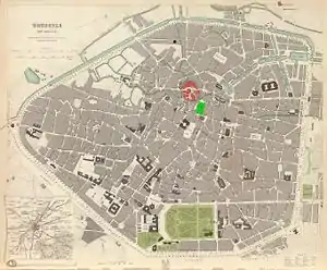 Map of Brussels in 1837. Saint-Géry Island is highlighted in red, the Brussels Stock Exchange is superimposed in green. North is roughly to the right.