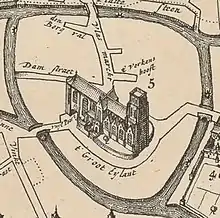 According to local legend, Saint Gaugericus of Cambrai built a chapel on the island around the year 580;[1] hence the name Brussels, which derives from the Old Dutch Bruocsella, Broekzele or Broeksel, meaning "marsh" (bruoc / broek) and "home" or "settlement" (sella / zele / sel) or "settlement in the marsh".[2][3] Starting in the 10th century, the church began to house the relics of the martyr Saint Gudula, who had died two centuries earlier, transferred there from Moorsel (located in today's province of East Flanders) by Duke Charles of Lower Lorraine. In 1047, these relics were transferred again by Count Lambert II of Leuven to the church that would later become the Cathedral of St. Michael and St. Gudula.[4]