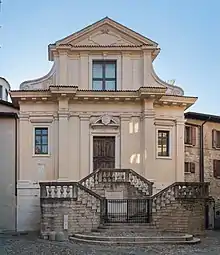 In addition, in the chapels on the left of the nave, there was a Virgin with Saints Francis of Paola and Leonard, by Giovanni Battista Pittoni.[3] A canvas depicting Virgin with Francis of Sales and St Catherine was attributed to Domenico Carretti. A Sacred Heart of Jesus was attributed to Antonio Dusi. A Dead Christ with St Charles is attributed to Savani. In the sacristy are some frescoes from the original romanesque church.[4] Saint George and the Princess by Cicognara also originated in the church.