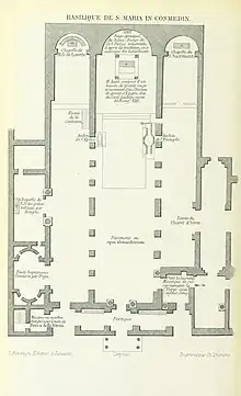 The church was built with a nave and two aisles, but it culminated at the east end with three full apses, an eastern feature unusual for a Roman church, but one that had reached the West by the sixth century.[11] In the rebuilding, the tall columns from the structure that preceded the diaconia were retained and were visible (and still are) in the entrance wall and embedded in the side walls at the western end of the church.[12] In the center apse was an altar made from a Roman red granite basin, and the floor was a simple opus sectile pattern.[13] The nave was separated from the aisles by alternating groups of columns and piers; the unmatched columns were spolia (spoils) from older Roman buildings. Some scholars believe that the columns supported a trabeation (lintel) at this time and not arches.[14] On the upper level of the outer walls, rows of clerestory windows repeated the motif of the arches in the diaconia that had opened into galleries.[15] By the ninth century, the church was known as Santa Maria in Cosmedin, probably the Latinization of κοσμίδιον (kosmidion), derived from the Greek word κόσμος, meaning "ornament, decoration."[16]