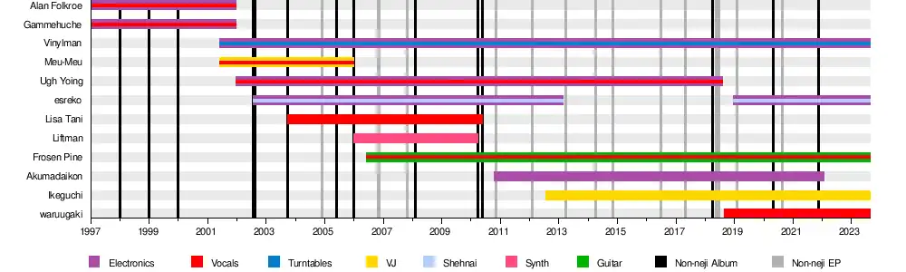 - Ugh Yoing (Takuya Karusawa) – turntables, MC, vocals, guitar (1997–2018)
