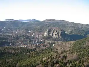 View from the peak of mount Scharfenstein to the town of Oybin and mount Lausche