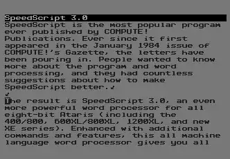 - ↑ Brannon, Charles (May 1985). "SpeedScript 3.0: All Machine Language Word Processor For Atari". Compute! (60): 103–111. ISSN 0194-357X. Retrieved 1 March 2015.