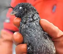 This crested auklet was oiled in Alaska during the spill of MV Selendang Ayu in 2004.