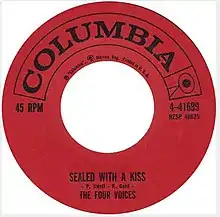 "Sealed with a Kiss" is a song written and composed by Peter Udell and Gary Geld. It first became a hit in 1962 for Brian Hyland. The original recording of "Sealed with a Kiss" was by The Four Voices which was released as a single in May 1960 without becoming a hit.[1] Jason Donovan later had an international number one hit with the song.