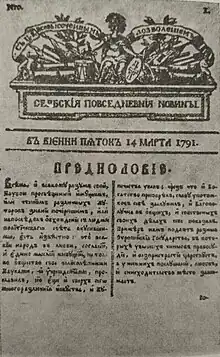 In October of 1790 they established both Serbian newspaper and Greek newspaper Efimeris.[4] The first issue of the Serbian newspaper was published on 14 March 1791 (Julian calendar).[4] There is no data on newspaper contributors but it is believed that the correspondent from Osijek was Stefan Rajić.[4] The newspaper followed the style of the other newspapers in the city and they published first Serbian reportages, book reviews and adds.[4]