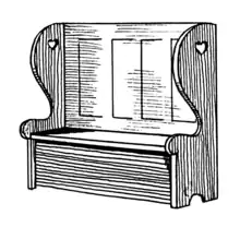 Settles are commonly movable, but occasionally fixed. The settle shares with the chest and the chair the distinction of great antiquity. Its high back was a protection from the draughts of medieval buildings, protection which was sometimes increased by the addition of winged ends or a wooden canopy. It was most frequently placed near the fire in the common sitting-room.[1] According to historian Claudia Kinmonth, in early furniture inventories the use of the terms bench and settle were interchangeable, but that generally a settle was understood to have arms.[2]