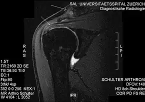 Plain x-rays of the shoulder can be used to detect some joint pathology and variations in the bones, including acromioclavicular arthritis, variations in the acromion, and calcification. However, x-rays do not allow visualization of soft tissue and thus hold a low diagnostic value.[2] Ultrasonography, arthrography and MRI can be used to detect rotator cuff muscle pathology. MRI is the best imaging test prior to arthroscopic surgery.[2] Due to lack of understanding of the pathoaetiology, and lack of diagnostic accuracy in the assessment process by many physicians,[19] several opinions are recommended before intervention.