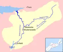 The Shubenacadie River (/ˌʃbəˈnækədi/) is a river in Nova Scotia, Canada. It has a meander length of approximately 72 km[2] from its source at Shubenacadie Grand Lake to its mouth at the historic seaport village of Maitland on Cobequid Bay, site of the building of the William D. Lawrence, the largest wooden ship ever built in Canada. In 2009, the I Backpack Canada blog named the Shubenacadie one of the top five whitewater rivers in Canada.[3] The lower 30 km of the river (from the point where the Stewiacke River meets to the mouth) is tidal and the river experiences a tidal bore twice daily, with some bores reaching up to 3 m in height at certain points along the river. Local tourism operators offer adventure seekers a chance to ride with the bore on high-horse power Zodiac Hurricanes. Tidal Bore Rafting was invented at the Tidal Bore Rafting Resort by H. Knoll. It is also a popular surfing spot for experienced Sea Kayakers.[4]