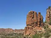 Sierra de Órganos is nestled within the Sierra Madre Occidental mountain range, in an area that corresponds to the physiographic province of the Mexican Plateau. The topography is uneven, with elevations ranging from 2,120 to 2,560 metres (6,960 to 8,400 ft) above sea level.[1] This gives rise to dramatic ridges and steep peaks that form small plateaus, often with very prominent, nearly vertical cliff faces. Small valleys surrounding the peaks afford scenic views of the rock formations from below.[5]