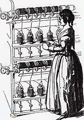 Silk throwing was originally a hand process relying on a turning a wheel (the gate) that twisted four threads while a helper, who would be a child, ran the length of a shade, hooked the threads on stationary pins (the cross) and ran back to start the process again. The shade would be a between 23 and 32 m long.[5][6] The process was described in detail to Lord Shaftesbury's Royal Commission of Inquiry into the Employment of Children in 1841: