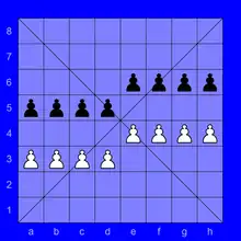2. Second stage: in each move, each player moves any one of their pieces (not a pawn) to any other empty place in their own half of the board, ignoring the usual move rules. Or they can move a pawn one square forwards and this ends the second stage and the third stage starts.