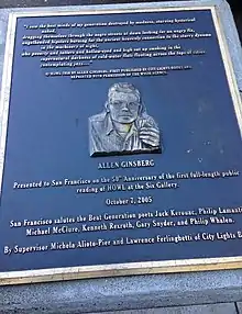 - ↑ Some sources have erroneously reported the date of the reading as October 13. (One example is Hendin, Josephine G. 2004. Concise Companion to Postwar American Literature and Culture. p. 79. New York: Wiley-Blackwell.) However, most scholars agree on the date October 7, as does the plaque honoring the event, pictured here. (The date is confirmed in Morgan, Bill and Nancy L. Peters, eds. 2006. Howl on Trial: The Battle for Free Expression. p. 1. San Francisco: City Lights Publishers; and Raskin, Jonah. 2006. American Scream: Allen Ginsberg's Howl and the Making of the Beat Generation. p. 154. Berkeley and Los Angeles: University of California Press.)