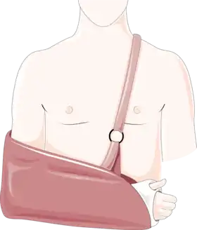 A sling, also known as arm sling, is a device to limit movement of the shoulder or elbow while it heals.[1] A sling can be created from a triangular bandage.[1]