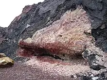Weathering of the coastline of the area leads to the continuous exposure of new mineral deposits from the muds that make up the underlying geology. These are typically colored red when iron-rich.