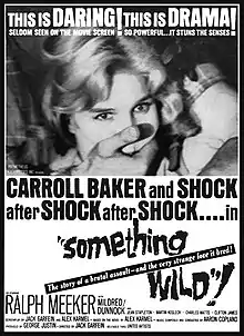 Something Wild is a 1961 American neo noir[3] psychological thriller film directed by Jack Garfein,[4][5] and starring Carroll Baker, Ralph Meeker, and Mildred Dunnock.[6] It follows a young New York City college student who, after being brutally raped, is taken in and held captive by a mechanic who witnessed her suicide attempt on the Manhattan Bridge. The film is based on the 1958 novel Mary Ann by Alex Karmel, who co-wrote the screenplay with Garfein.