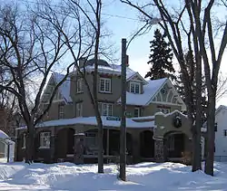 The Sommerville/Petitt House is a municipally-designated, historic building located in the Nutana neighbourhood of Saskatoon, Saskatchewan, Canada. [1] The property is a 2+1⁄2-story, stucco-and-brick house in a blended Tudor Revival and Spanish Revival style constructed in 1912.[2] Features of the building include a tower topped with a bell-cast dome, a large arched porch with porte-cochere, and a carriage entrance supported by fieldstone pillars.[3]