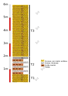 - Section 1 (T1): it forms the wall of the series and is 0.5 m (1.6 ft) thick. It is formed by arkoses with a clayey matrix, and in this section of the Somosaguas Sur deposit there are a large number of micro and macrovertebrate fossils.