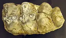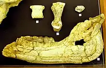 The Somosaguas Sur site has a great richness of micromammal fossils (more than 400 fossil teeth were found in 50 kg (110 lb) of sediment) that have allowed us to assign it to the Middle Aragonian E biozone (13.75–14.10 million years ago).[8][note 1] The taxa identified belong to different groups: Gliridae (Microdyromys koenigswaldi, Microdyromys monspeliensis and Armantomys tricristatus), Sciuridae (Heteroxerus grivensis and Heteroxerus rubricati), Cricetidae (Megacricetodon collongensis, Democricetodon darocensis, Cricetodon soriae and Democricetodon lacombai), Insectivora (Miosorex grivensis and Galerix exilis), Lagomorpha (Lagopsis penai and Prolagus oeningensis) and Reptilia (Chelonia, Lacertidae and Anguidae).[9] Among the macrovertebrates, remains of the mastodon Gomphotherium angustidens have been recovered; from the family Rhinocerotidae, the taxon Alicornops simorrense has been identified; from the family Equidae, remains of Anchitherium have been found; and among the ruminants, there are fossils of the genera Heteroprox (Cervidae), Micromeryx (Moschidae) and Tethytragus (Bovidae). There is also a suid, Conohyus.[10]