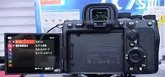 The α7S III has a TFT LCD screen with a size of 7.5 cm (3 inches) and resolution of 1,440,000 dots (800 x 600 pixels) (SVGA) with an adjustable tilt angle of 107 degrees up and 41 degrees down (approximate). The OLED electronic viewfinder has a resolution of 9,437,184 dots (2048 x 1536 pixels) (3.15MP) (QXGA) and a .90x magnification.[8]