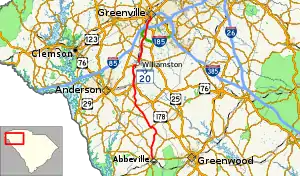 South Carolina Highway 20 (SC 20) is a primary state highway in the U.S. state of South Carolina. The highway connects the cities of Abbeville, Belton, Williamston and Greenville. The 53-mile-long (85 km) highway is signed as a west-east highway though it physically runs south-to-north.[4]