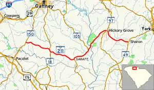 SC 211 was established by 1942 as a renumbering of part of SC 105, from SC 105 to SC 5 in Hickory Grove.[4][5] In 1951–52, SC 211 was extended east to its current eastern terminus with SC 91 in Sharon, replacing part of SC 5.[6] In 1955–56, SC 211 was extended west to its current western terminus with SC 18 (later becoming SC 150), replacing SC 98. This is the third and current version of SC 211.[7]