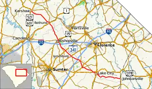 SC 341 begins at the intersection of Georgetown Highway (SC 41/SC 51) and Broadway Street in central Johnsonville. SC 341 heads west along East Broadway Street through the town's business district. At a railroad crossing, the road name changes to West Broadway and continues past additional businesses. After exiting the city limits, the road's name changes to Lake City Highway but passes some other small businesses, houses, and churches. Further from the city, more farmland begins to surround the roadway. At the community of Prospect Corner, the road name becomes Johnsonville Highway but the highway's surroundings is generally the same. Before entering Lake City, SC 341 passes in front of some commercial and industrial warehouses. Upon entering Lake City, SC 341 travels through it on Main Street, first through a residential neighborhood with an elementary school located along it. At Church Street, US 378 Bus. joins SC 341 on a concurrency through the city. Commercial businesses line both sides of the street upon the beginning of the concurrency. In the center of the city, the two routes intersect US 52. After passing Matthews Road west of the downtown area, the road enters another residential neighborhood but then heads into an area with more farmlands. Upon its intersection with US 378, US 378 Bus. ends and SC 341 has a short 1⁄4-mile-long (0.40 km) concurrency with US 378.[6]