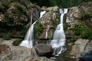 The South Fork Coquille River has two major waterfalls, situated in a steep and remote canyon just upstream of the first major northward bend of its course. These are the 35-foot (11 m) Upper Coquille River Falls,[7] and the much larger 110-foot (34 m) Coquille River Falls.[8]