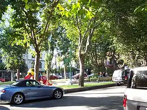The two halves of the South Park Street re-join at both ends of the park and continue for short, straight stretches before terminating at Second Street on one end and Third Street on the other. This creates a curved line of buildings, which gives the street and park an unusual enclosed, urban character. Local businesses, restaurants and many apartment buildings dot the street.