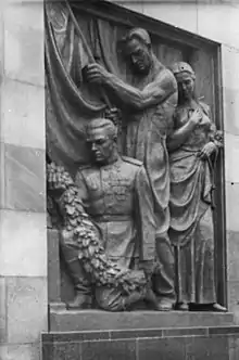 A statue of the personification of Mother Russia is situated in front of the obelisk and constitutes the main focal point of the memorial. On the statue's base, which is made out of black porphyry, sit 42 bronze tablets on which the names of fallen officers are inscribed.
