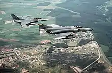 A F-4G Phantom II (foreground) and a F-16C Fighting Falcon of the 23rd Tactical Fighter Squadron, both assigned to the 52nd Tactical Fighter Wing, fly over Spangdahlem AB during 1989