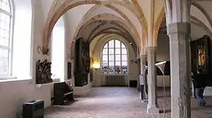 Most of the rooms on the ground floor are preserved in their original condition: the cloister, the refectories, the Remter (the largest room of the nunnery, probably the working and day room of the nuns, and from 1733 the refectory of the poorhouse), the chapter house, and the sacristy of the nuns' church. In the south western corner of the cloister is the calefactory.