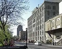 Elevators No. 2 & 3 were large grain elevators south of the Washburn A mill complex. They were separated from the complex by railroad tracks and connected by a conveyor tunnel. Elevator 2 (1916) was just north of 10th Ave S, and elevator 3 (1929) was just south (outside the Historic District). They accepted grain from rail box cars or trucks (1958) and fed the mills. When milling ended in 1965 the elevators were used for storage, with grain coming in by truck (or rail) and shipped out by rail or river barge (1969). Minneapolis bought the elevators in 1987 and General Mills (Washburn-Crosby) continued to use the elevators until 1993, when use ended and the elevators stood vacant. The end of the once heavy rail use at the falls facilitated redevelopment. The elevators were demolished 1998, and likely nothing remains. Gold Medal Park now occupies the site.[40][8]