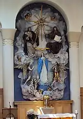 Beyond a south-east porch, the layout of the church is easily read, with nave, aisles and chancel all within three bays. There are no aisle windows, but circular windows appear in the north wall and throughout clerestory. The interior is dominated by the huge, cheerful, brightly painted altarpiece depicting the Coronation of Our Lady carved in wood. It is said, though it is much disputed, that it was shown at the Great Exhibition of 1851 as an example of Tyrolean craftsmanship and was, at one time, destined for Westminster Cathedral.[3] Our Lady is attended by angels in various attitudes in piety and prayer. A golden, winged crown hovers above Her head. The seated figures of Christ and God the Father look on from above and behind Her. The Holy Spirit in the form of a dove sheds rays of light out towards cherubim who are half concealed in the clouds that form the background of the whole tableau. Father Williamson's taste is less evident in other parts of the church. The statue of St. Casimir located to the right of the altar is a piece of fine art made in Lithuania from Ancaster limestone by famous Lithuanian sculptor Antanas Žukauskas in 2009.