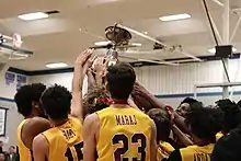 SJB raises the Senior Boys 2020 HWCDSB basketball championship trophy.