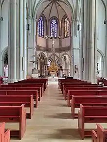 St. Marien is a three-aisled hall church without a transept. The main aisle is three bays long. The bays in the central nave are slightly rectangular. Both side aisles are four bays deep, these having a slight oblong shape. The central nave is separated from the side aisles by archways consisting of large compound piers. The extension of the side aisles by one bay each enables the inclusion of the western tower in the interior architecture. On the eastern side, the nearly-quadratic hall is appended by the polygon-shaped basilican chancel. Attached to the chancel on the north side is the quadratic sacristy, covering four bays. This has four arches, all buttressed by one central compound pier. The Gothic hall is overlaid by ribbed vaults. The nave is 20.56 metres long in total, which represents only a slight difference from the length and width measurements (roughly 25.5 and 24.5 metres respectively). This gives the nave an almost-cubical shape. The central nave is only slightly wider than the side aisles. This results in merely a weak accentuation of the longitudinal axis of the church. The bays of the side aisles counteract this slight longitudinal alignment by opening up their broadsides to the central nave, thus emphasising the lateral alignment. This gives the impression of undirected space. St. Marien is thus characterised by the overall appearance of its nave.