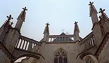 The buttress of the Marienkirche in Osnabrück is given a very vivid design by the pinnacles as well as the neo-Gothic balustrades. This dynamic image contrasts with the sober forms of nearby St. Peter's Cathedral as well as the more austere neighbouring market houses.
