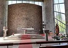 Wörsdorf had only few Catholic inhabitants until the end of World War II, when many people arrived as refugees who were expelled from Silesia, East Prussia, Sudetenland and Hungary. They were transported by bus to church services in St. Martin, Idstein.[1] Plans to build a local church resulted in a 1959 commission to Johannes Krahn,[1] who built several churches and early skyscrapers such as the Beehive House in Frankfurt am Main. It was first also meant to serve as a Autobahnkirche for the near-by highway.[2] That purpose had to be given up when a planned exit was not approved.[2] Construction began in 1961,[1] and the church was consecrated on 8 December 1962. It was dedicated to Nicholas of Flüe, and named Friedenskirche ("Peace Church").[1][3]