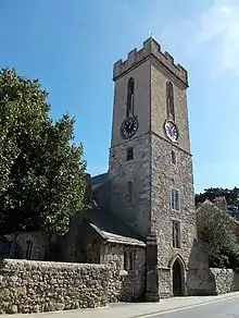 The church consists of nave with north and south aisles, a chancel and a western tower. The original church was said by local tradition to have been at the east end of the town, and its foundations were visible in the old churchyard in 1845. Destroyed by the French in their raid of 1377, it is said to have been rebuilt on the present site only to be again reduced to a ruin in 1543. At the beginning of the 17th century it was practically rebuilt, and reconsecrated by John Davenant the Bishop of Salisbury on 11 March 1626. The chancel, which had a polygonal roof with enriched bosses at the intersection of the ribs, was lengthened by 12 ft. in 1889.