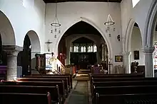 Inside, the nave roof is 15th or 16th century. There is a piscina in the chancel, and the font is Mediaeval. In the south aisle are the remains of a cross which dates from between the 10th and 12th centuries. There are several 17th century monuments, and 17th century oak panelling in the apse, which may have been relocated from Mexborough Old Hall. The Creed, Lord's Prayer and the Ten Commandments are inscribed in the north aisle, uncovered by the Victorian restoration, and some of the stalls were designed by Robert Thompson.[1][3]
