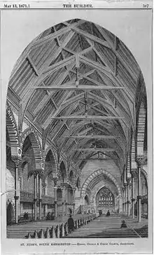St Jude's Church, Courtfield Gardens, Kensington, London, was designed by architects George Godwin and Henry Godwin, and built between 1867 and 1870; the tower and spire were constructed in 1879. It was built on the northern portion of Captain Robert Gunter's estate. The project was overseen by Reverend J. A. Aston, and financed by John Derby Allcroft, a wealthy glove manufacturer.[1] The construction, not including the tower, pulpit, font and organ cost £11,300, and was undertaken by Myers & Sons.[2]