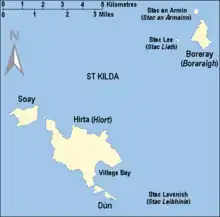 Stac Levenish or Stac Leibhinis (sometimes simply called Levenish/Leibhinis) is a sea stack in the St Kilda archipelago in Scotland. Lying 2.5 kilometres (1+14 nautical miles) off Village Bay on Hirta, it is part of the rim of an extinct volcano that includes Dùn, Ruaival and Mullach Sgar.[2]