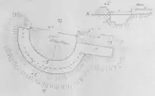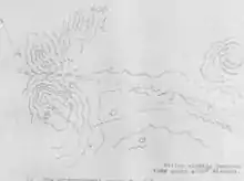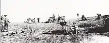 Viewing across the open eastern flank was possible from the top of the "curiously shaped heaps of broken earth" near Shellal.[39] Two tels, indicating possible sites of ancient cities, stood high above the plain and also provided excellent views. The spectacular, flat-topped Tel el Jemmi, with its perpendicular sides, one side dropping into the Wadi Ghazza, could be seen for miles. It had been used as a lookout during the first battle of Gaza.[41] Tel el Fara, on the Rafa to Beersheba road, was a flat-topped prominence with conical sides 7 miles (11 km) further south, and was approximately 16 miles (26 km) inland from the coast in the centre of the Gaza to Beersheba front line. This large mound, near the Wadi Ghazza at Shellal, was thought to have been built by the crusaders in the 13th century as an observation post; and it gave an "uninterrupted view for several miles northward and eastward."[39] At the base of Tel el Fara huge stone buttresses and several courses of cut stone could be seen at water level.[41][42]
