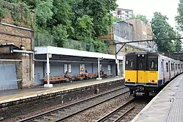 A smoked glass/steel-framed ticket office was built in the early 1980s to replace the original ticket hall on the same site. The platforms are located in a narrow cutting and are accessed by uncovered concrete staircases also installed at this time.