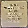 Anna Mahlerová was born on 4 December 1851 in Pravonin. From 1929 to 1938, she lived with her son in Podbořany. On 3 October 1938, during the Nazi occupation of Sudetenland, she fled to Říčany. Thereafter, she lived with her granddaughter, Kamila Fišerová (see above) and her family. Together, with most of the family members, she was arrested and deported on 10 August 1942 from Prague to Theresienstadt concentration camp by transport Ba. Her transport number was 1374. In the same year, on 19 October 1942, she was deported from Theresienstadt to Treblinka extermination camp with transport Bw. Her transport number was 998. There she was murdered by the Nazi regime.[14][15]