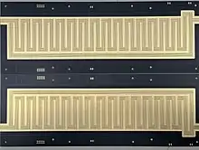 The two mirrored halves of a SLIM system are shown in the example to the left. Compared to the longer pathlength systems developed at PNNL, this board is considerably shorter but serves as a rapid prototype.[6] When folded together and spaced ~3 mm apart, the co-planar electrode surfaces create the fields needed for ion confinement and separation.