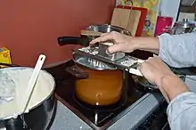 Spätzle dough or batter being scraped directly into boiling water in a home kitchen