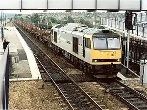 ![]() Class 60 locomotive no. 60050 'Roseberry Topping' passes through platform 1 of Swinton railway station in 1991 | |
