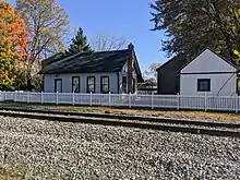 Throughout the 1830s and 1840s, rail transportation saw significant expansion throughout the Great Lakes region. In 1833, the Erie and Kalamazoo Railroad was chartered as part of the Lake Shore and Michigan Southern Railway, running from former Port Lawrence, Michigan (now Toledo, Ohio), to the mouth of the Kalamazoo River at Lake Michigan.[13] Trains were at first pulled by horse until the first steam locomotive was installed in 1837. Sylvania built its own railroad depot along the Erie-Kalamazoo Railroad in 1858.[14] While the depot is no longer in operation, the original station building exists as an exhibit in the Sylvania Historical Village, still next to the railroad which remains in use.