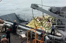 Search-and-recovery operations were conducted by federal, state, and local agencies, as well as by government contractors.[1]: 363–365 Personnel in an HH-60 Pave Hawk helicopter of the New York Air National Guard witnessed the explosion from about eight miles away and arrived at the scene of the explosion while debris was still falling into the water, forcing the crew to retreat. They reported their sighting to the tower at Suffolk County Airport. Remotely operated vehicles (ROVs), side-scan sonar and laser line-scanning equipment were employed to search for and investigate underwater debris fields. Victims and wreckage were recovered by scuba divers and ROVs. Later, scallop trawlers were used to recover wreckage embedded in the sea floor.[1]: 63 In one of the largest diver-assisted salvage operations ever conducted, often working in very difficult and dangerous conditions, more than 95% of the airplane wreckage was eventually recovered.[32][33]: 1 The search-and-recovery effort identified three main areas of wreckage underwater, which were classified by color.[1]: 65 The yellow, red, and green zones contained wreckage from the front, center, and rear sections of the airplane, respectively.[1]: 65–74 The green zone with the aft portion of the aircraft was located the farthest along the flight path.[1]: 71–74